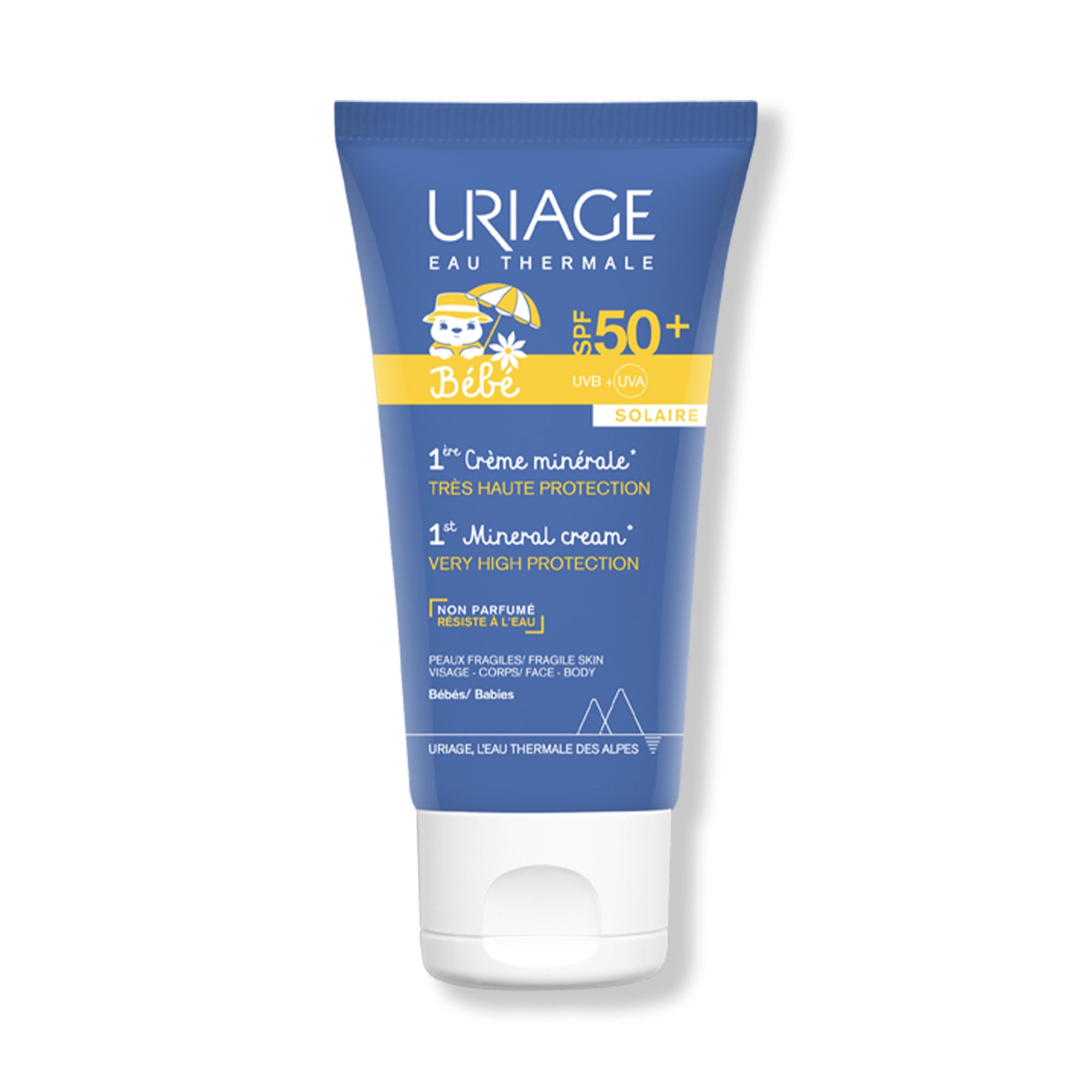 Specially formulated for babies' sensitive skin, 1ère Crème Minérale SPF50 offers very high mineral-based sun protection for the face and body. It defends against UVA and UVB rays while keeping skin soft and hydrated thanks to Uriage Thermal Water and Aquaspongines®. The lightweight, fragrance-free formula is water-resistant and made with 85% ingredients of natural origin. Dermatologically and pediatrically tested, it ensures high tolerance, making it ideal for everyday use on delicate baby skin. Comes in eco-designed, recyclable packaging.