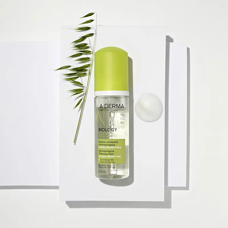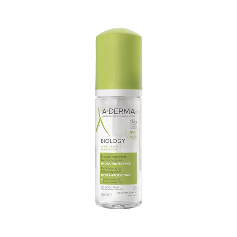 A-DERMA Biology Mousse Nettoyante Dermatologique Hydra-Protectrice Bio (150 ml) is a gentle cleansing foam that removes makeup and up to 90% of pollution particles while moisturizing and protecting fragile facial skin.