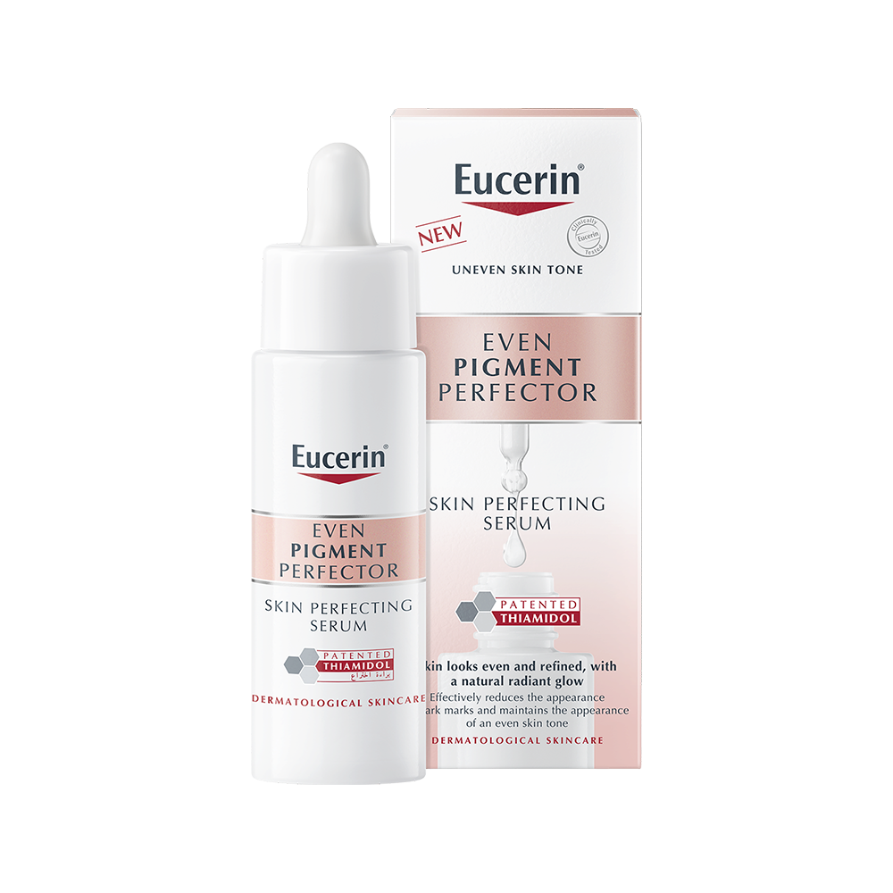 Eucerin Even Pigment Perfector Skin Perfecting Serum is a lightweight, radiance-boosting formula that visibly reduces pigment spots and enhances skin’s natural glow. Powered by patented Thiamidol, it targets the root cause of hyperpigmentation by reducing melanin production and helps prevent dark spots from returning. Enriched with Hyaluronic Acid, it delivers deep hydration to leave skin smooth, supple, and refreshed. With regular use, this serum refines skin tone, boosts luminosity, and reveals a more even and radiant complexion in as little as two weeks. Clinically and dermatologically proven to be effective and suitable for all skin types.