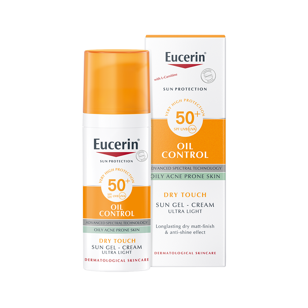 Eucerin Oil Control Gel-Cream SPF 50+ is a lightweight daily facial sunscreen designed for oily and blemish-prone skin. It features Advanced Spectral Technology with UVA/UVB filters and Licochalcone A to neutralize free radicals. Enriched with Glycyrrhetinic Acid for DNA repair and L-carnitine to regulate sebum, it offers long-lasting anti-shine and a dry-touch finish. Fragrance-free, fast-absorbing, and suitable under makeup, this non-comedogenic formula is clinically proven for sensitive and acne-prone skin.