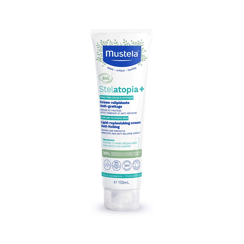 Mustela Stelatopia Cream soothes, moisturizes and replenishes extremely dry, eczema-prone skin with Sunflower Oil Distillate (patented Active Lipid-Replenishing Process) Shea Butter, Avocado oil, a patented natural ingredient specifically designed, to provide essential lipids to maintain the skin's moisture barrier and Prebiotic to help protect the skin's ecosystem to rebalance it.
